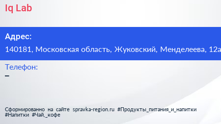 Iq Lab по адресу 140181, Московская область, Жуковский, Менделеева, 12а в дальнейшем Организация, размещена в следующих категориях: