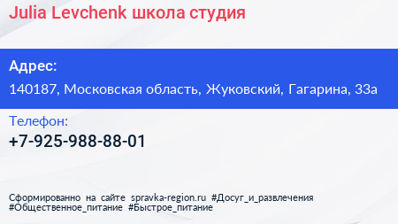 Julia Levchenk, школа-студия по адресу 140187, Московская область, Жуковский, Гагарина, 33а в дальнейшем Организация, размещена в следующих категориях: