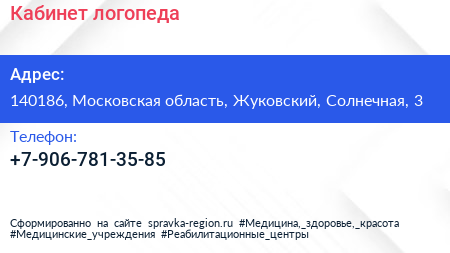 Кабинет логопеда по адресу 140186, Московская область, Жуковский, Солнечная, 3 в дальнейшем Организация, размещена в следующих категориях: