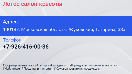 Лотос, салон красоты по адресу 140187, Московская область, Жуковский, Гагарина, 33а в дальнейшем Организация, размещена в следующих категориях: