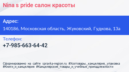 Nina`s pride, салон красоты по адресу 140186, Московская область, Жуковский, Гудкова, 13а в дальнейшем Организация, размещена в следующих категориях: