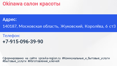 Okinawa, салон красоты по адресу 140187, Московская область, Жуковский, Королёва, 6 ст3 в дальнейшем Организация, размещена в следующих категориях: