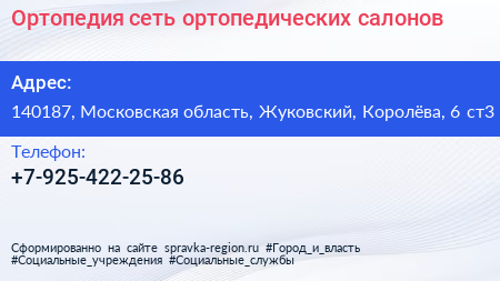 Ортопедия, сеть ортопедических салонов по адресу 140187, Московская область, Жуковский, Королёва, 6 ст3 в дальнейшем Организация, размещена в следующих категориях: