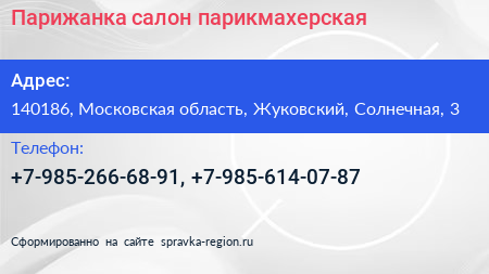 Парижанка, салон-парикмахерская по адресу 140186, Московская область, Жуковский, Солнечная, 3 в дальнейшем Организация, размещена в следующих категориях: