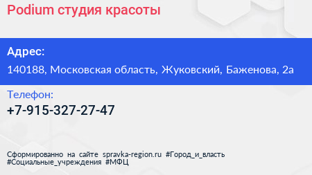 Podium, студия красоты по адресу 140188, Московская область, Жуковский, Баженова, 2а в дальнейшем Организация, размещена в следующих категориях:
