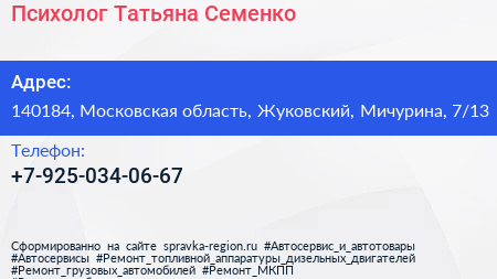 Психолог Татьяна Семенко по адресу 140184, Московская область, Жуковский, Мичурина, 7/13 в дальнейшем Организация, размещена в следующих категориях: