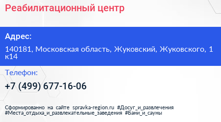 Реабилитационный центр по адресу 140181, Московская область, Жуковский, Жуковского, 1 к14 в дальнейшем Организация, размещена в следующих категориях: