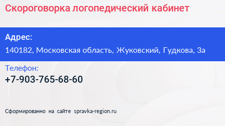 Скороговорка, логопедический кабинет по адресу 140182, Московская область, Жуковский, Гудкова, 3а в дальнейшем Организация, размещена в следующих категориях: