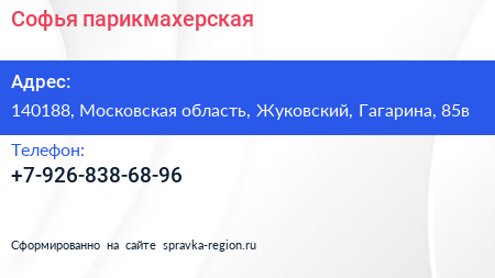 Софья, парикмахерская по адресу 140188, Московская область, Жуковский, Гагарина, 85в в дальнейшем Организация, размещена в следующих категориях: