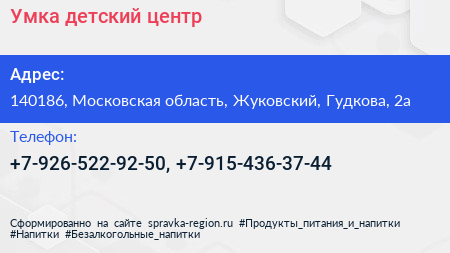 Умка, детский центр по адресу 140186, Московская область, Жуковский, Гудкова, 2а в дальнейшем Организация, размещена в следующих категориях: