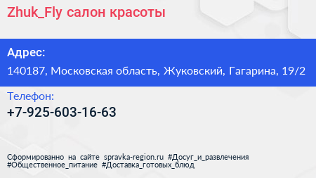Zhuk_Fly, салон красоты по адресу 140187, Московская область, Жуковский, Гагарина, 19/2 в дальнейшем Организация, размещена в следующих категориях: