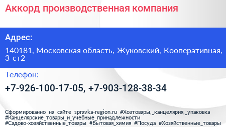 Аккорд, производственная компания по адресу 140181, Московская область, Жуковский, Кооперативная, 3 ст2 в дальнейшем Организация, размещена в следующих категориях: