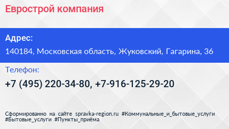 Еврострой, компания по адресу 140184, Московская область, Жуковский, Гагарина, 36 в дальнейшем Организация, размещена в следующих категориях: