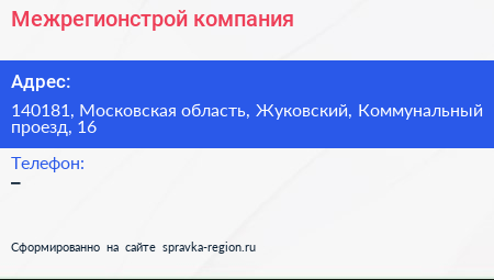 Межрегионстрой, компания по адресу 140181, Московская область, Жуковский, Коммунальный проезд, 16 в дальнейшем Организация, размещена в следующих категориях: