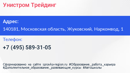 Унистром-Трейдинг по адресу 140181, Московская область, Жуковский, Наркомвод, 1 в дальнейшем Организация, размещена в следующих категориях: