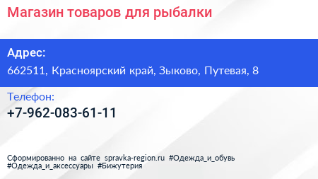 Магазин товаров для рыбалки по адресу 662511, Красноярский край, Зыково, Путевая, 8 в дальнейшем Организация, размещена в следующих категориях: