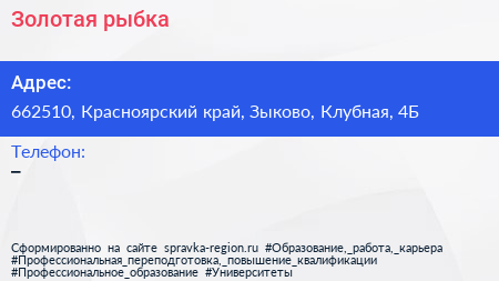 Золотая рыбка по адресу 662510, Красноярский край, Зыково, Клубная, 4Б в дальнейшем Организация, размещена в следующих категориях: