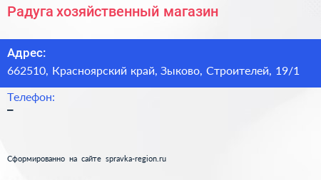 Радуга, хозяйственный магазин по адресу 662510, Красноярский край, Зыково, Строителей, 19/1 в дальнейшем Организация, размещена в следующих категориях: