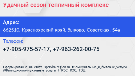 Удачный сезон, тепличный комплекс по адресу 662510, Красноярский край, Зыково, Советская, 54а в дальнейшем Организация, размещена в следующих категориях: