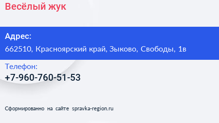 Весёлый жук по адресу 662510, Красноярский край, Зыково, Свободы, 1в в дальнейшем Организация, размещена в следующих категориях: