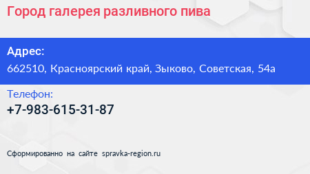 Город, галерея разливного пива по адресу 662510, Красноярский край, Зыково, Советская, 54а в дальнейшем Организация, размещена в следующих категориях: