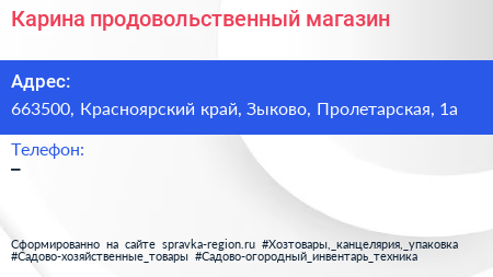 Карина, продовольственный магазин по адресу 663500, Красноярский край, Зыково, Пролетарская, 1а в дальнейшем Организация, размещена в следующих категориях:
