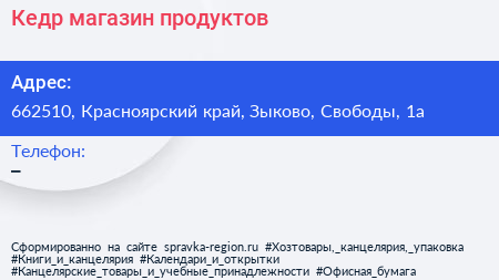 Кедр, магазин продуктов по адресу 662510, Красноярский край, Зыково, Свободы, 1а в дальнейшем Организация, размещена в следующих категориях: