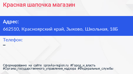 Красная шапочка, магазин по адресу 662510, Красноярский край, Зыково, Школьная, 18Б в дальнейшем Организация, размещена в следующих категориях: