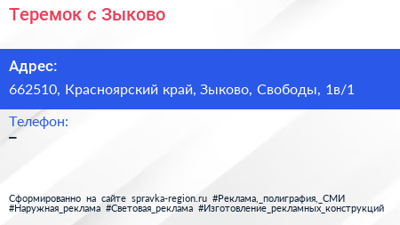 Теремок, с. Зыково по адресу 662510, Красноярский край, Зыково, Свободы, 1в/1 в дальнейшем Организация, размещена в следующих категориях: