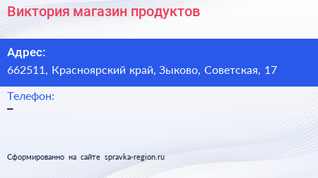 Виктория, магазин продуктов по адресу 662511, Красноярский край, Зыково, Советская, 17 в дальнейшем Организация, размещена в следующих категориях: