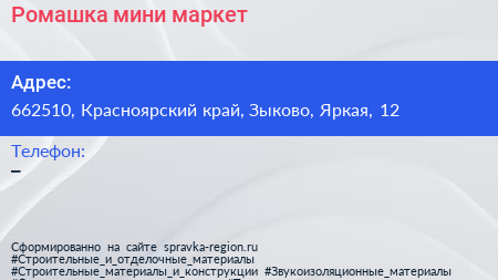 Ромашка, мини-маркет по адресу 662510, Красноярский край, Зыково, Яркая, 12 в дальнейшем Организация, размещена в следующих категориях: