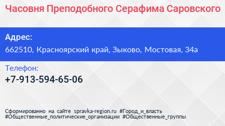Часовня Преподобного Серафима Саровского по адресу 662510, Красноярский край, Зыково, Мостовая, 34а в дальнейшем Организация, размещена в следующих категориях: