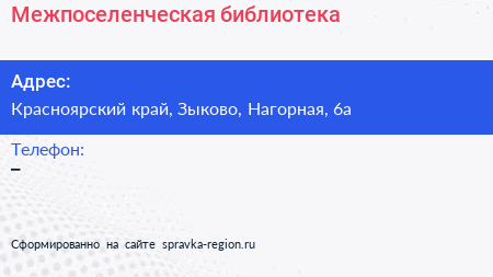 Межпоселенческая библиотека по адресу Красноярский край, Зыково, Нагорная, 6а в дальнейшем Организация, размещена в следующих категориях: