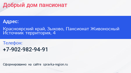 Добрый дом, пансионат по адресу Красноярский край, Зыково, Пансионат Живоносный Источник территория, 4 в дальнейшем Организация, размещена в следующих категориях:
