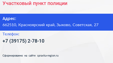 Участковый пункт полиции по адресу 662510, Красноярский край, Зыково, Советская, 27 в дальнейшем Организация, размещена в следующих категориях: