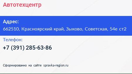 Автотехцентр по адресу 662510, Красноярский край, Зыково, Советская, 54е ст2 в дальнейшем Организация, размещена в следующих категориях: