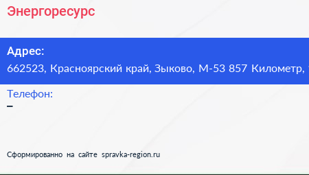 Энергоресурс по адресу 662523, Красноярский край, Зыково, М-53 857 Километр, 1 в дальнейшем Организация, размещена в следующих категориях: