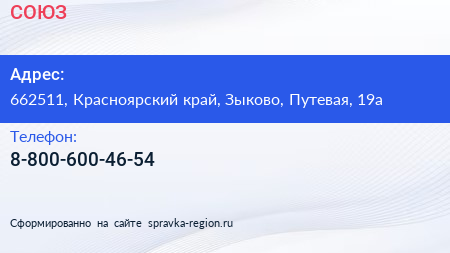 СОЮЗ по адресу 662511, Красноярский край, Зыково, Путевая, 19а в дальнейшем Организация, размещена в следующих категориях: