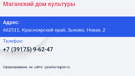 Маганский дом культуры по адресу 662511, Красноярский край, Зыково, Новая, 2 в дальнейшем Организация, размещена в следующих категориях: