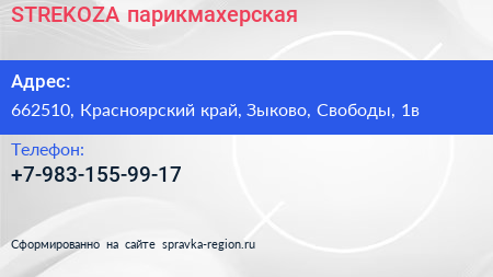 STREKOZA, парикмахерская по адресу 662510, Красноярский край, Зыково, Свободы, 1в в дальнейшем Организация, размещена в следующих категориях: