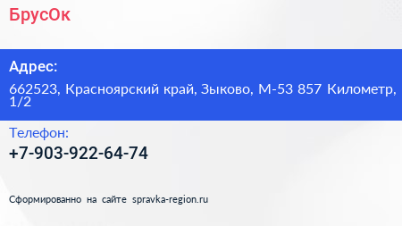 БрусОк по адресу 662523, Красноярский край, Зыково, М-53 857 Километр, 1/2 в дальнейшем Организация, размещена в следующих категориях: