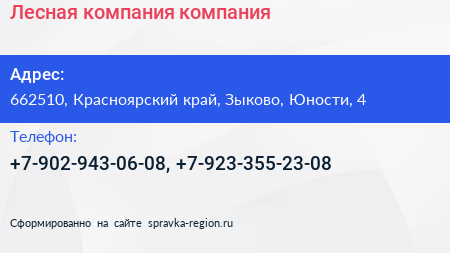 Лесная компания, компания по адресу 662510, Красноярский край, Зыково, Юности, 4 в дальнейшем Организация, размещена в следующих категориях: