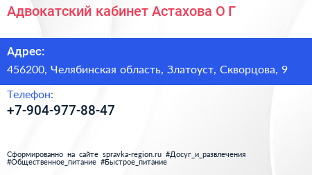 Адвокатский кабинет Астахова О.Г. по адресу 456200, Челябинская область, Златоуст, Скворцова, 9 в дальнейшем Организация, размещена в следующих категориях: