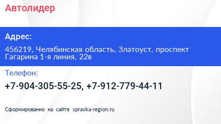 Автолидер по адресу 456219, Челябинская область, Златоуст, проспект Гагарина 1-я линия, 22в в дальнейшем Организация, размещена в следующих категориях: