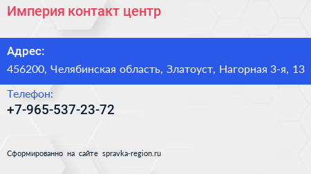 Империя, контакт-центр по адресу 456200, Челябинская область, Златоуст, Нагорная 3-я, 13 в дальнейшем Организация, размещена в следующих категориях: