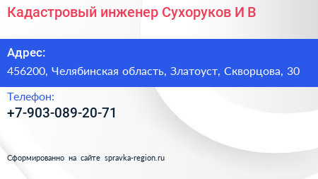 Кадастровый инженер Сухоруков И.В. по адресу 456200, Челябинская область, Златоуст, Скворцова, 30 в дальнейшем Организация, размещена в следующих категориях: