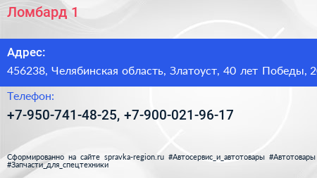 Ломбард №1 по адресу 456238, Челябинская область, Златоуст, 40 лет Победы, 20 в дальнейшем Организация, размещена в следующих категориях: