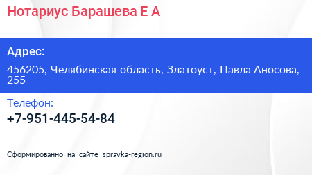 Нотариус Барашева Е.А. по адресу 456205, Челябинская область, Златоуст, Павла Аносова, 255 в дальнейшем Организация, размещена в следующих категориях: