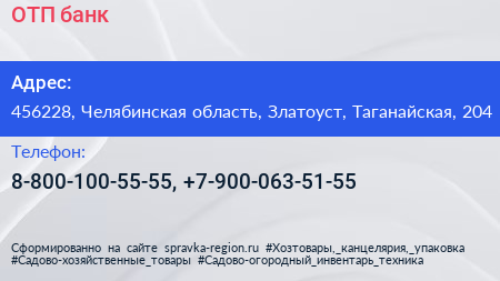 ОТП банк по адресу 456228, Челябинская область, Златоуст, Таганайская, 204 в дальнейшем Организация, размещена в следующих категориях: