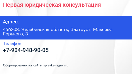 Первая юридическая консультация по адресу 456208, Челябинская область, Златоуст, Максима Горького, 3 в дальнейшем Организация, размещена в следующих категориях: